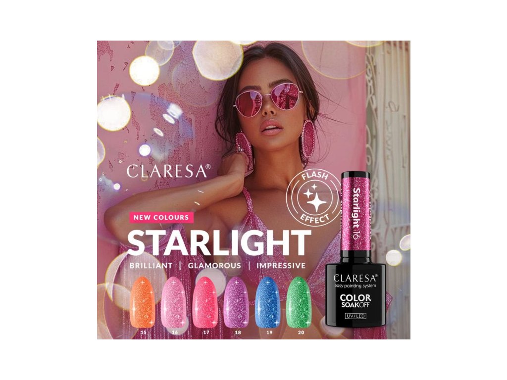 Claresa Starlight Kolekcia je limitovaná séria šiestich oslňujúcich hybridných gél lakov, ktoré prinesú do vašej manikúry žiarivý glamour efekt. Inšpirovaná nočnou oblohou, diskotékovými svetlami a trblietkami reflektorov, táto kolekcia je stvorená pre výrazné a energické osobnosti. Každý odtieň v sebe ukrýva hru svetla a farby – od horúcich neónov po iskrivé metalické tóny.