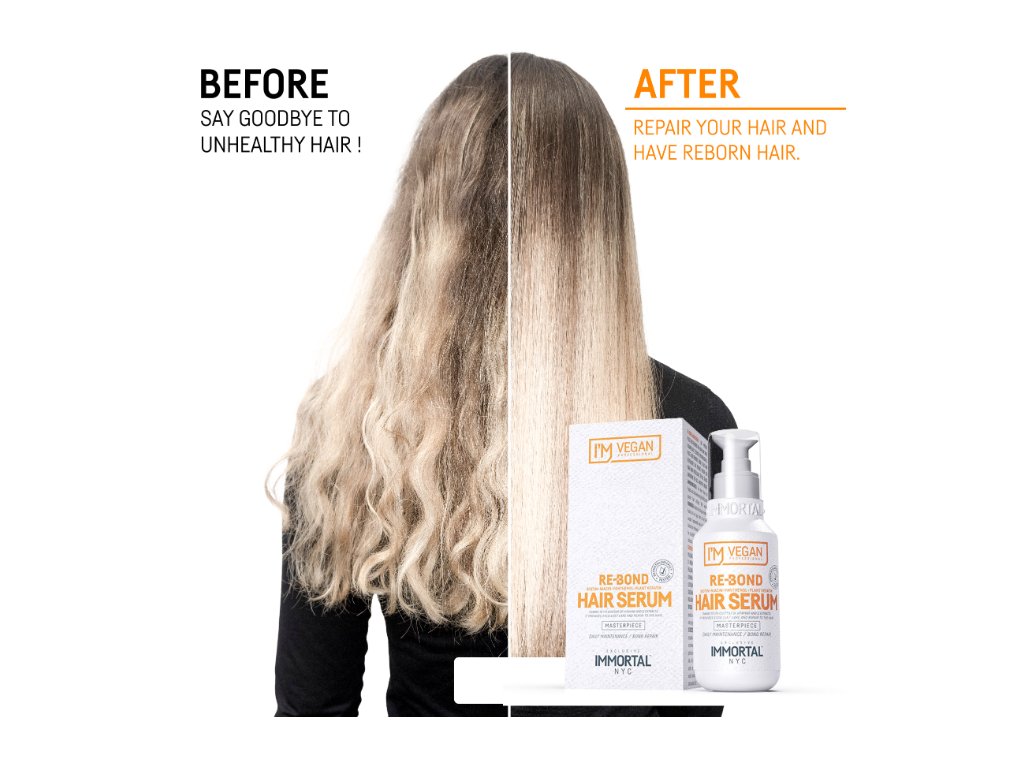 IMMORTAL NYC RE-BOND Hair Serum je revolučný, posilňujúci elixír pre vaše vlasy. S vegánskym zložením bez obsahu sulfátov, parabénov a silikónov poskytuje intenzívnu regeneráciu a ochranu bez zaťaženia.