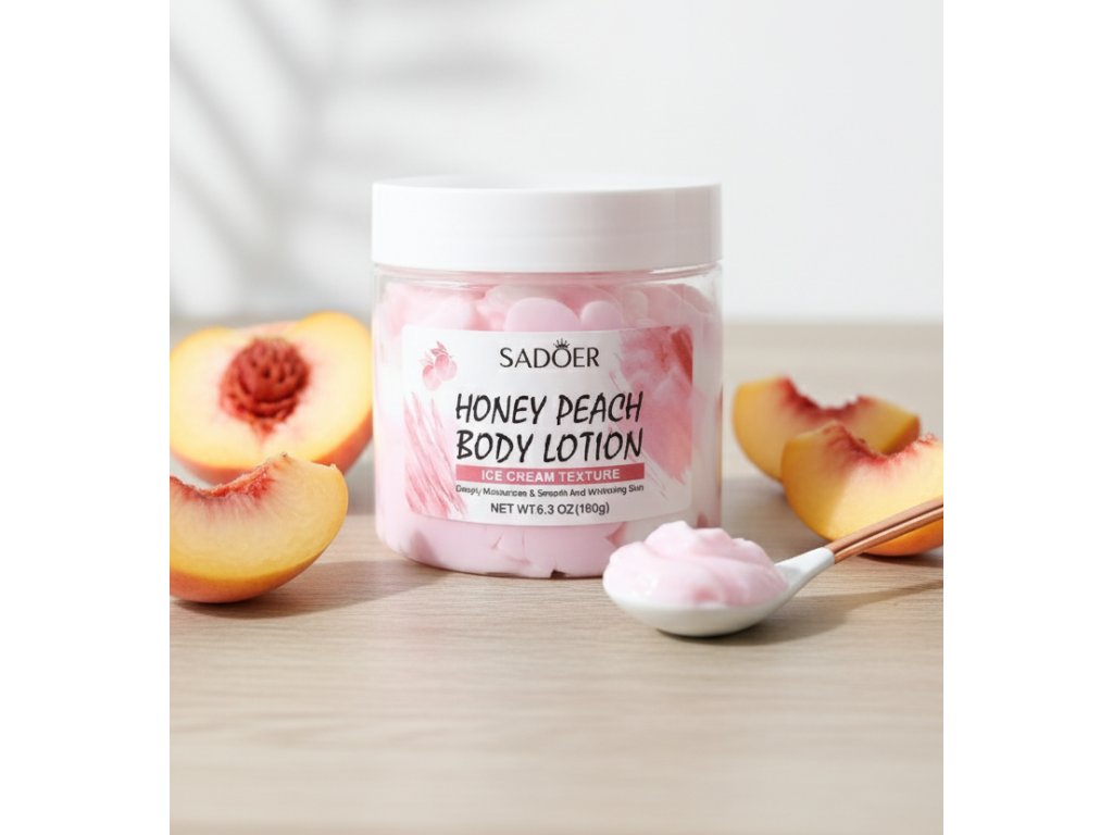 Doprajte svojej pokožke sladký dotyk broskýň s telovým mliekom Sadoer Honey Peach. Jeho lahodná „ice cream“ textúra sa ľahko nanáša, okamžite sa vstrebáva a zanecháva pokožku hydratovanú, jemnú a prevoňanú šťavnatou broskyňovou arómou. Vďaka intenzívnej hydratácii pomáha spevniť pokožku, zlepšuje jej pružnosť a rozjasňuje tón.